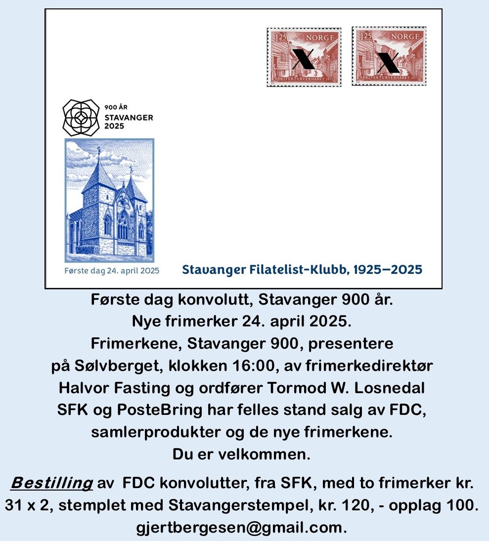 7 | Stavanger 900 år Førstedagskonvolutt - bestillingsinfo Den øverste kan fortsatt leveres. De to andre er utsolgt. |